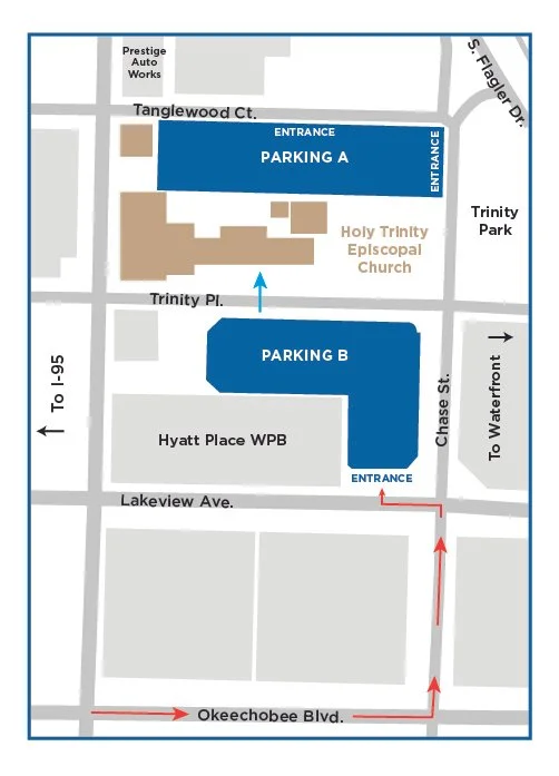 Parking B is located in the white Philip’s Point parking garage immediately south of the church. Driving down Okeechobee, turn left onto Chase, then left onto Lakeview, then immediately turn into the garage. Take a ticket at the garage entrance and park your vehicle. Exit through the north car opening onto Trinity Place and enter through the red South Transept door into the Baptistry. Before leaving the church, pick up a QR code ticket from an usher at the church’s east (main) entrance. This coded ticket is needed as a form of payment to exit the garage.